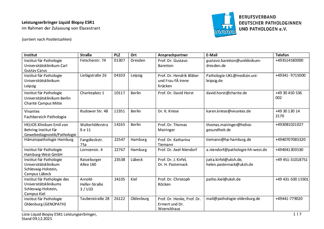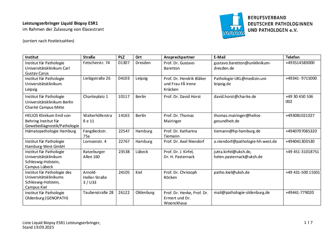 Pathologische Institute, die ebenfalls die ESR1-Liquid Biopsy anbieten, aber noch nicht in der Liste aufgeführt sind, bitten wir um Meldung unter bvpathologie.de, so dass stets eine vollständige Übersicht gegeben ist.