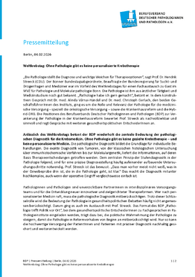 Anlässlich des Weltkrebstags betont der BDP wiederholt die zentrale Bedeutung der pathologischen Diagnostik für die Krebsmedizin. Ohne Pathologie gibt es keine gezielte Krebstherapie – und keine personalisierte Medizin. Die pathologische Diagnostik bildet die Grundlage für individuelle Behandlungen. Die exakte Diagnostik von Tumoren, von der klassischen histologischen Untersuchung über immunhistochemische Verfahren bis zur Molekulargenetik, liefert die Informationen, auf deren Basis Therapieentscheidungen getroffen werden. Dem zentralen Prinzip der Stufendiagnostik in der Pathologie folgend, sind für eine präzise Diagnosestellung häufig aufeinander aufbauende Untersuchungsschritte notwendig. Prof. Streeck ist das bewusst. „Dass man vorher meist nicht weiß, was in der Gewebeprobe drin ist, die in die Pathologie geht, ist klar.“ Das macht die Diagnostik mitunter hochkomplex, auch wenn der operative Eingriff vergleichsweise einfach ist.