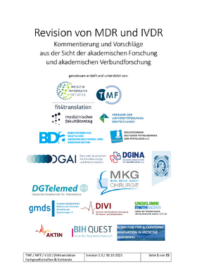 In dem vom deutschen Bundesministerium für Forschung, Technologie und Raumfahrt (BMFTR) geförderten Begleitforschungsvorhaben zur Medizininformatik-Initiative wurden in Zusammenarbeit mit der TMF – Technologie- und Methodenplattform für die vernetzte medizinische Forschung e. V., unter Einbeziehung des Medizinischen Fakultätentags und des Verbands der Universitätsklinika Deutschlands e. V. sowie weiterer Fachgesellschaften und Verbände (aufgeführt unter Abschnitt 15) konkrete Kommentierungen und Vorschläge erarbeitet, die darauf abzielen, die MDR/IVDR praxisgerechter auszugestalten. Dabei stehen drei Anliegen im Vordergrund: