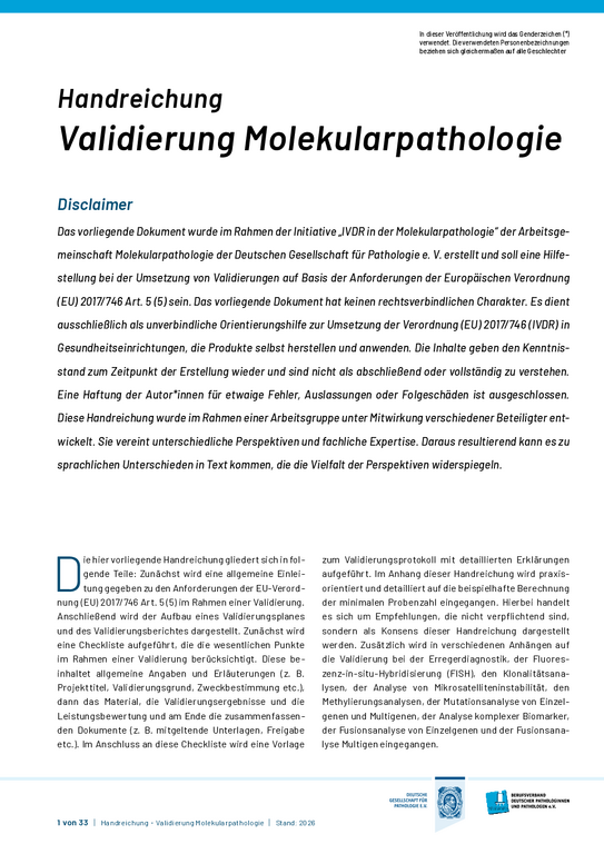 Die Handreichung „Validierung Molekularpathologie“ bietet eine unverbindliche Hilfestellung bei der Umsetzung von Validierungen von IH-IVD auf Basis der Anforderungen von Art. 5 (5) IVDR. Sie enthält unter anderem